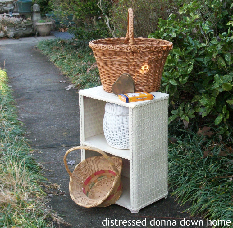 An old rattan bathroom cabinet, a Mexican Easter basket, a large market basket, covered white basket, brass heart wall pocket, and flash cards.